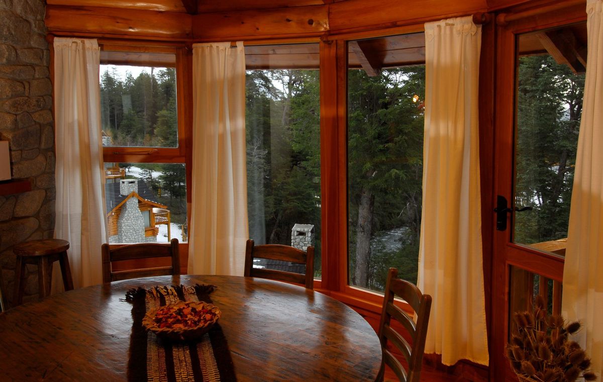 Cabañas junto al Río Bonito, en Villa La Angostura. Desayuno, Wi-Fi, estacionamiento. Amplio parque, bajada al río y muy cerca del acceso a Cerro Bayo